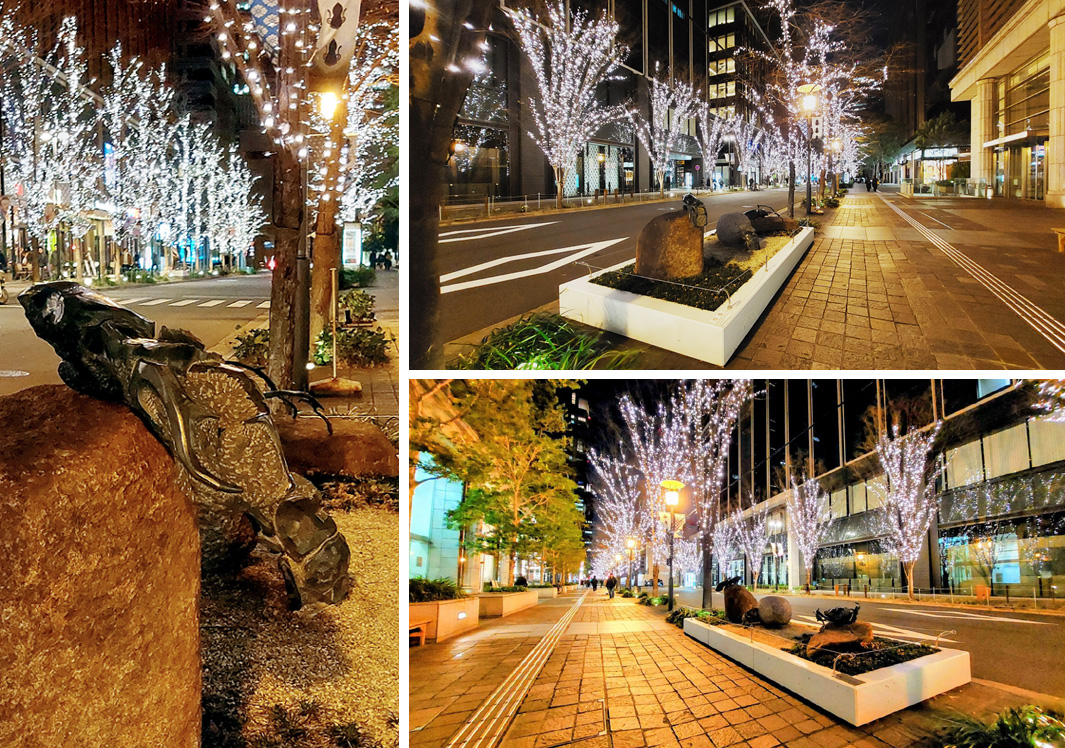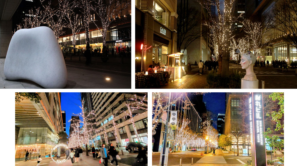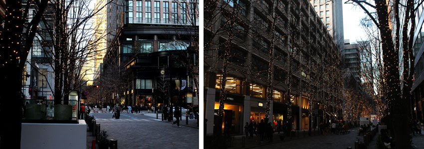 東京駅から歩いて丸の内仲通りへ。陽が暮れはじめると街路樹のイルミネーションが点灯します。薄暮の中で街を歩くと、夜のにぎわい