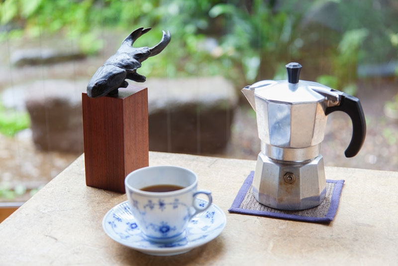 コーヒーのときも作品がお供します。庭と彫刻をながめ、ほっとするひととき。