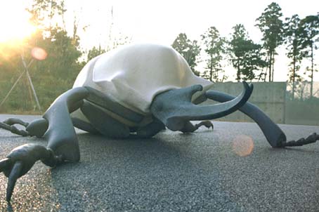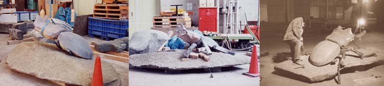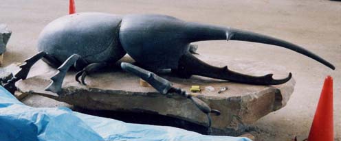 動かすときはオビをかけてクレーンで釣ります。このクワガタは1トンくらいです。