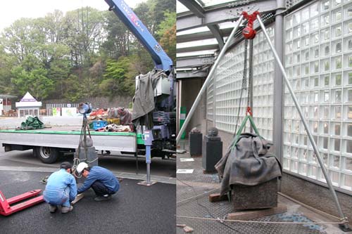 設置の様子。ユニックでおろし、三又(さんまた)で設置します。