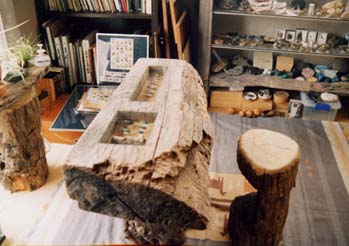 2000.10 拾った木にノミで穴を彫ってゆきます。