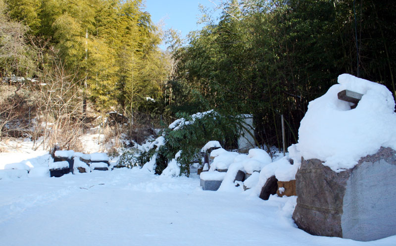 アトリエにも雪が降った。石に雪が積もり、竹が雪の重さで頭を垂れている。