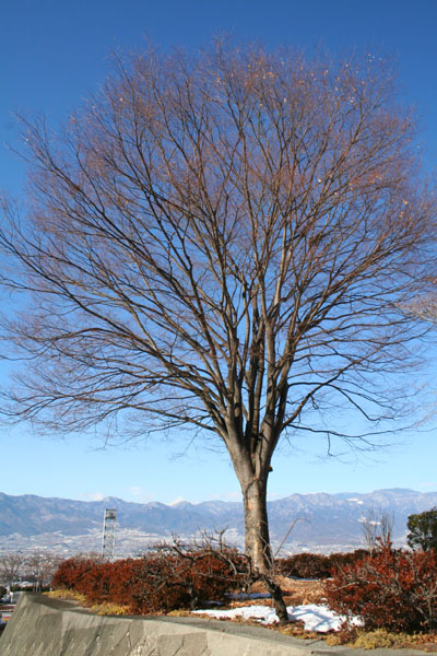南アルプスと甲府盆地を望む見晴らしいの良い立地に、美しいケヤキが立っていた。