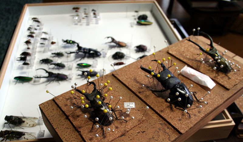 注文依頼されたカブトムシを制作中。制作しながらも、手を休めると虫たちが周りにたくさんいる。