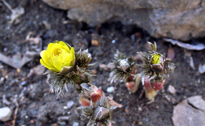 庭の福寿草が咲いた。今年は寒いため、かなり遅い開花となった。