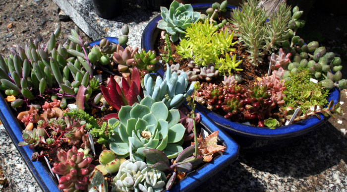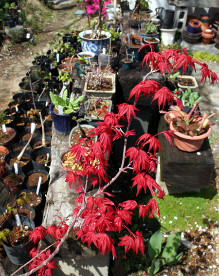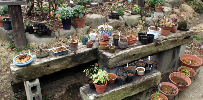 植え替えを終えた植物と植え替えを待つ鉢たち。