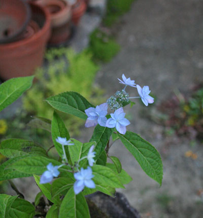 七段花というアジサイ。苔玉に植えてあるが、茶色くなってきたので鉢に