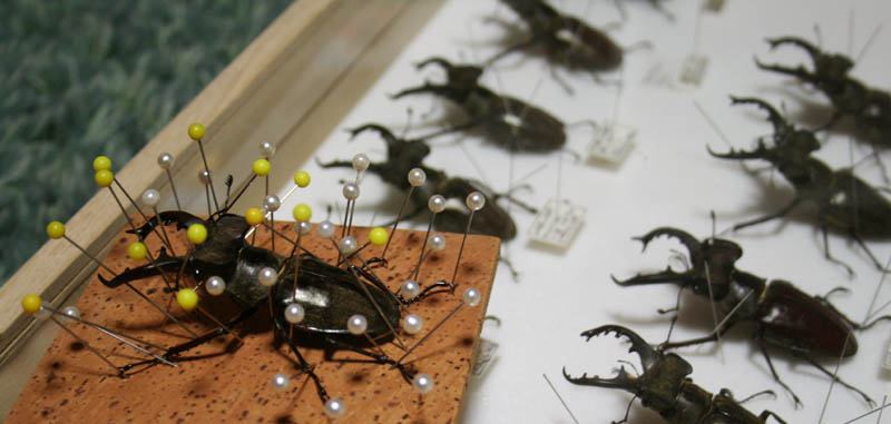 ミヤマクワガタを展足、この針の多さはどうだろう。佐藤せいわ式の展足では、生きてる感が大事。