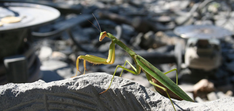 オオカマキリが制作中の作品の上で日向ぼっこをしている。このご婦人はお腹が大きいねぇ。