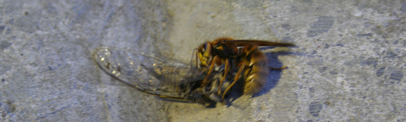キイロスズメバチがセミを襲っている。この時期はエサが少なくなるのと、巣が大所帯になるのとで彼らは凶暴になる。私が近寄ってもお構いなしだ。