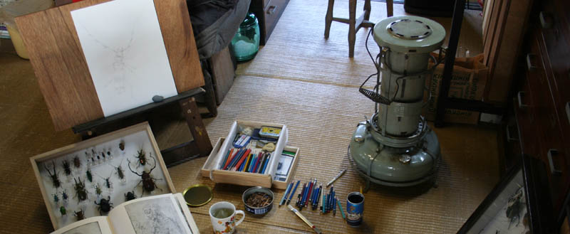 ようこそ虫のアトリエへ。ここでは作品を生み出す現場、山梨のアトリエやその周辺の