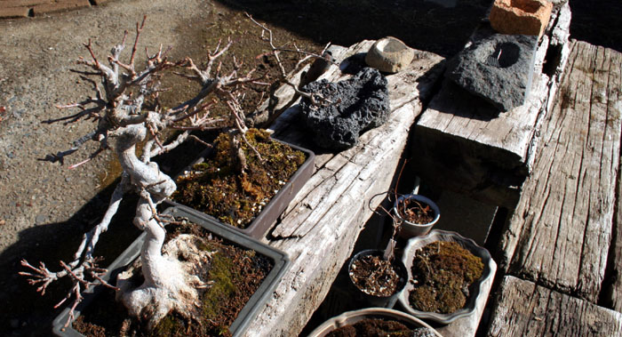 右下はフジザクラ盆栽のつぼみが膨らんできたところ。