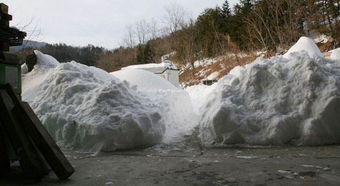 アトリエの雪かきをしようにも、雪の量が多すぎて運べない。通り道を作るのが精一杯だ。