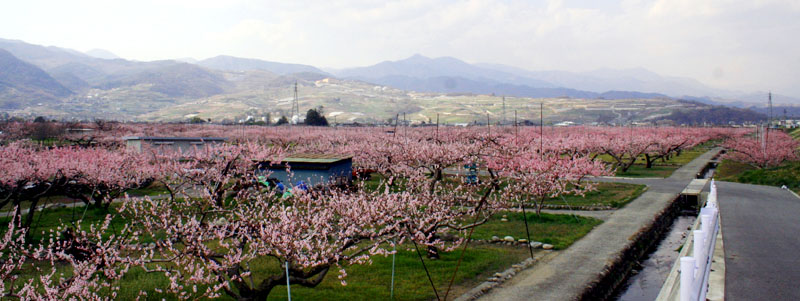 山梨の盆地ではこの時期、どこを走っていても桃の花が広がっている。