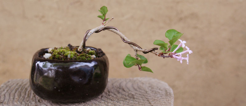 リラの花が咲いた。自作の鉢で半懸崖風。