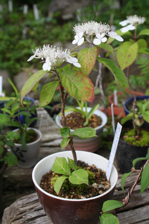 アトリエから挿し木で持ち帰った山アジサイが咲いた。白くてかわいらしい花だ。