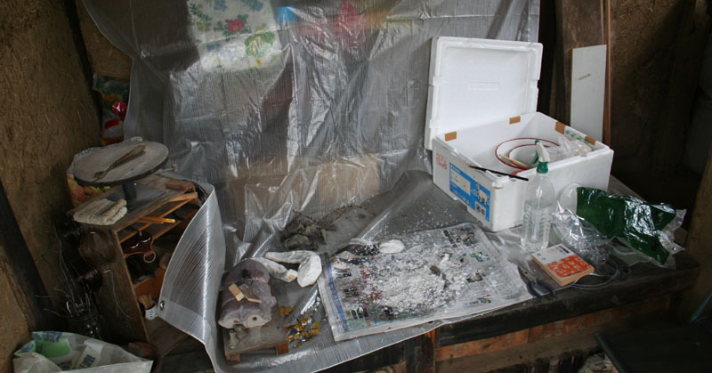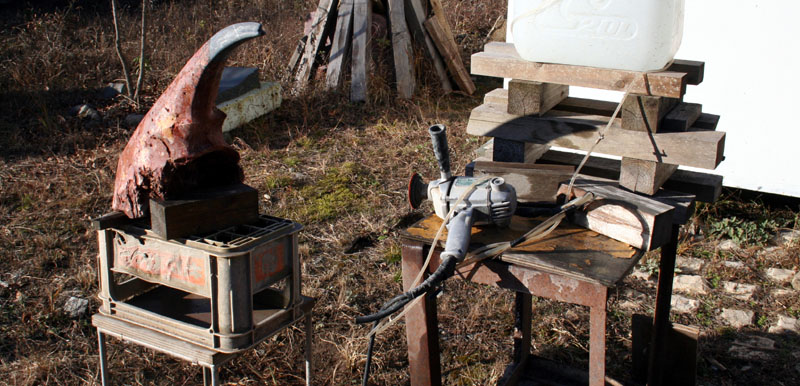 今は五右衛門風呂の小屋にシートを張って作業する。壁は土で出来ており、真冬に石膏取りをしていたら