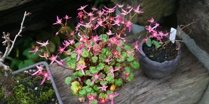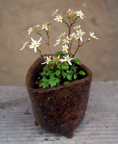 コナラの小品盆栽と、自作鉢に植えたダイモンジソウ。