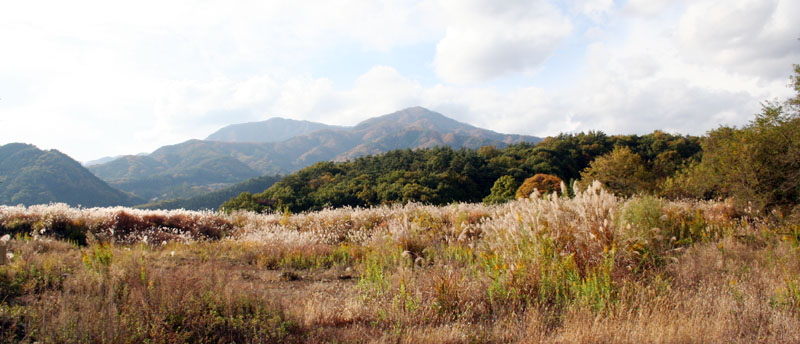 ススキが一面に広がっている。遠くの山から、順に紅葉が降りてくるのがおもしろい。