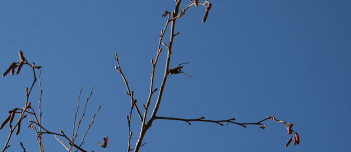 一休み・・と石の上に寝そべったら、モズのはやにえだろうか。ハンノキの枝にバッタが刺さっている。