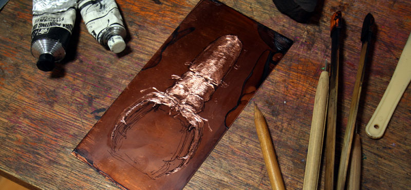 銅版画を制作中。慣れない作業なので、何度も試しながら進めるが、それも楽しい。