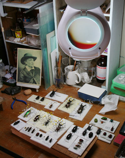 作業机の標本たち。ライトつきルーペを使って見ると大迫力。