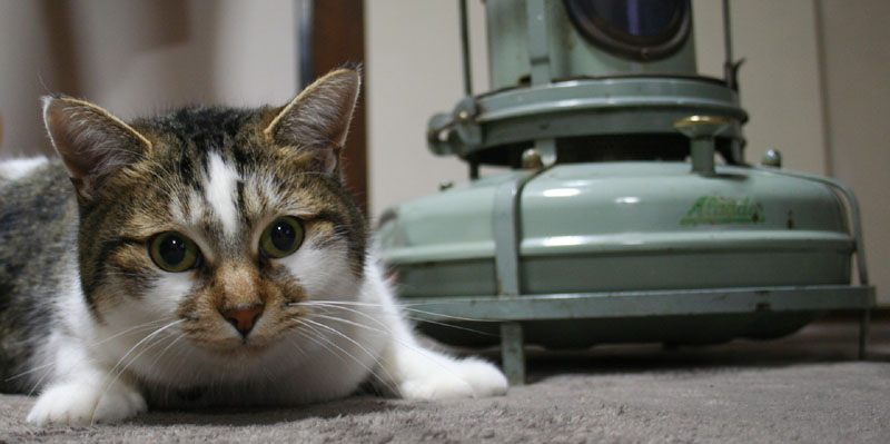 アラジンストーブ15型の横で暖をとるユキ。