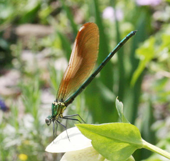庭に来た美しいトンボ。指で簡単につかまえられる。
