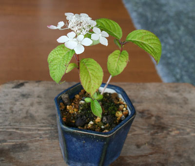 アトリエから挿し木したヤマアジサイが今年も咲いた。