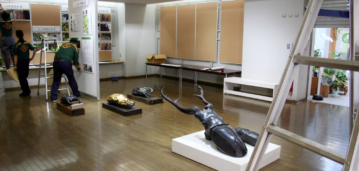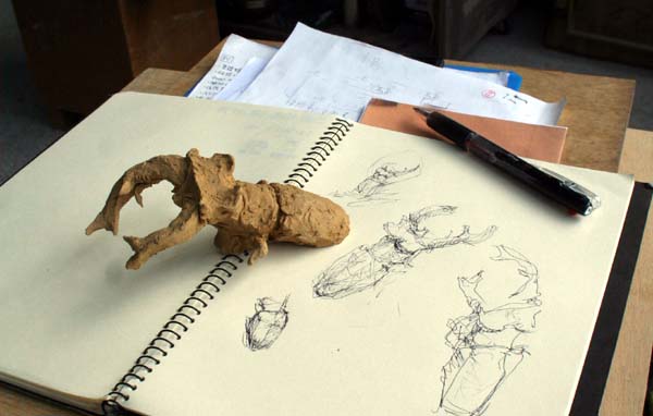 新作のヨーロッパミヤマクワガタを制作中。私の作品は、展示場所や運搬を考慮してこのように分割して作るようになったが、