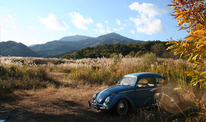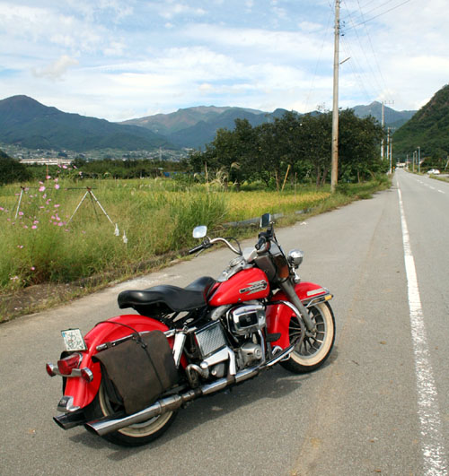 秋晴れにはこの赤いヤツ。馬革のサイドバッグに油をくれてやろうか。