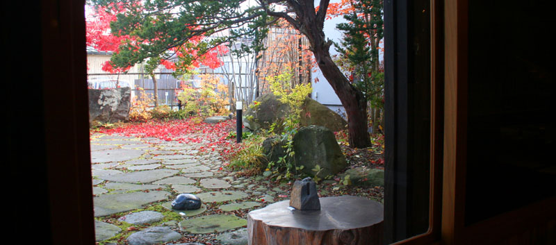 山形の個展会場から庭を望む。石の作品は、庭によく合う。