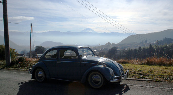 遠くに富士山、手前に塩の山が島のように浮かんでいる。